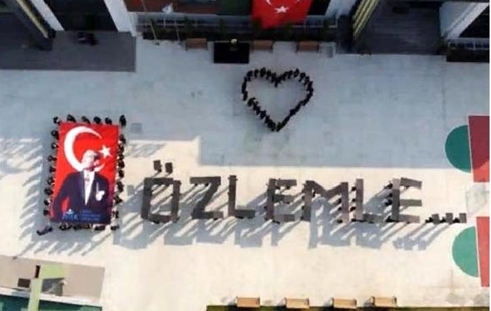 Öğrenciler, saat Atatürk’ün 10 Kasım 1938’de hayata gözlerini yumduğu 09.05’e geldiğinde sirenler çalarken 1938 yazısında sonsuzluk şeklini oluşturdu. İstekli öğrenciler ve öğretmenler çok özel koreografiyi üzerinde Atatürk’ün resminin bulunduğu ay-yıldızlı bayrağı açıp kalp şekli ve “Özlemle” yazısıyla tamamladı.