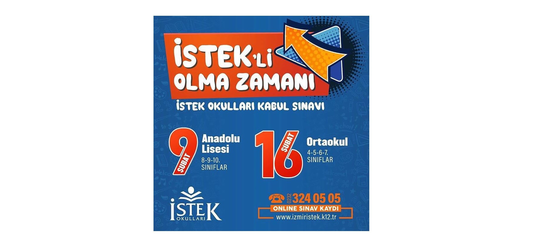 İstek İzmir Anadolu Lisesi'ne girişte 8, 9, 10 ve 11. sınıflarda öğrenim gören öğrenciler için yapılacak anadolu lisesi sınavı 9 Şubat Pazar günü, 4, 5, 6 va 7. sınıf öğrencilerinin gireceği ortaokul sınavı ise 16 Şubat Pazar günü düzenlenecek. Sınavlar İstek İzmir Okulları Mavişehir Kampüsü'nde yapılacak. Kabul sınavları, Türkiye çapındaki tüm İstek Okulları kampüslerinde eş zamanlı başlayacak. Sınavda başarı gösteren öğrencilere belirli oranlarda burs verilecek.