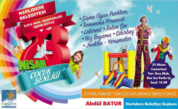 Narlıdere Belediyesi, Ilıca Mahalle Muhtarlığı ile ortaklaşa düzenleyeceği şenlikte, çocuklara unutulmaz bir 23 Nisan yaşatmayı amaçlıyor. 23 Nisan günü saat 14.00'te Narkız Parkı içinde düzenlenecek olan etkinlikte şişme oyun parkları, palyaçolar, yüz boyama, temsili meclis açılışı, çocuklar tarafından hazırlanan halk oyunları gösterisi, 'Adam Olacak Çocuk' etkinliği, 23 Nisan temalı resim yarışması yer alacak. Ayrıca Narlıdere Belediyesi 23 Nisan şenliğine katılan öğrencilerine çocuk kitapları hediye edilecek.