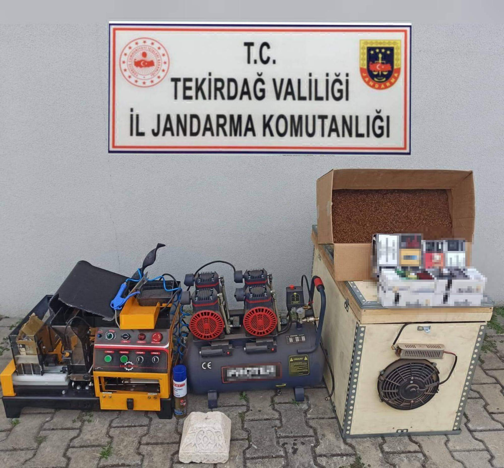 Kapaklı İlçe Jandarma Komutanlığı ekipleri, kaçak tütün ürünlerinin bulunduğunu belirlediği E.H.'nin Yanıkağıl Mahallesi'ndeki evinde arama yaptı. Aramada, tarihi eser niteliği taşıdığı belirtilen taş, kompresör, dolum makinesi, 28 kilogram kıyılmış tütün ve 1600 boş makaron ele geçirildi. Gözaltına alınan E.H., hakkında işlem yapıldı. (DHA)