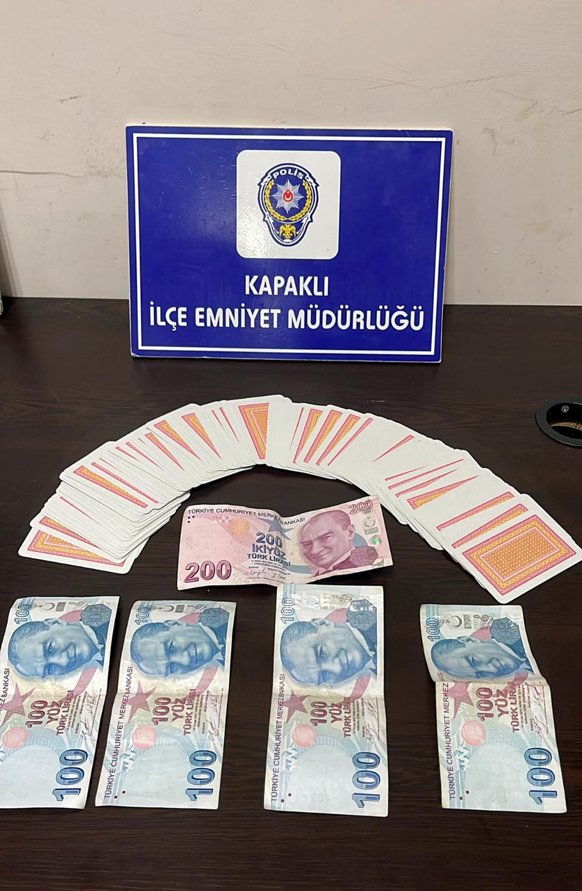 Kapaklı İlçe Emniyet Müdürlüğü Asayiş Büro Amirliği ekipleri, Atatürk Mahallesi Yıldız Caddesi'nde bir işyerinde kumar oynatıldığını belirledi. İ.S.'ye ait işyerine operasyon düzenleyen polis, 4 kişinin kumar oynadığını tespit etti. Masada bulunan 600 lira ve 104 oyun kağıdı muhafaza altına alınırken, kumar oynayan 4 kişiye ise 25 bin 700 TL para cezası uygulandı. İşletme sahibi İ.S.'ye ise 'Kumar oynatılmaya yer temini ve imkanı sağlama' suçundan adli işlem yapıldı. (DHA)
